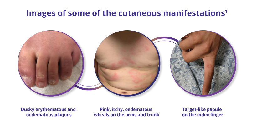 | Urticarial lesions | Migratory, pruritic, oedematous, variably-sized wheals within 24 hours, without bruising or hyperpigmentation and/or angioedema | Perivascular lymphocytic infiltrate, scattered eosinophils, and upper dermal oedema with no virally induced cytopathic changes | These lesions might be present prior to the onset of a fever or alongside pyrexia and cough. Lesions are typically a sign of a serious illness. Second-generation antihistamines are used to treat the symptoms of SARS-CoV-2-related urticaria. Short-term use of antihistamines and steroids can improve urticaria lesions. |