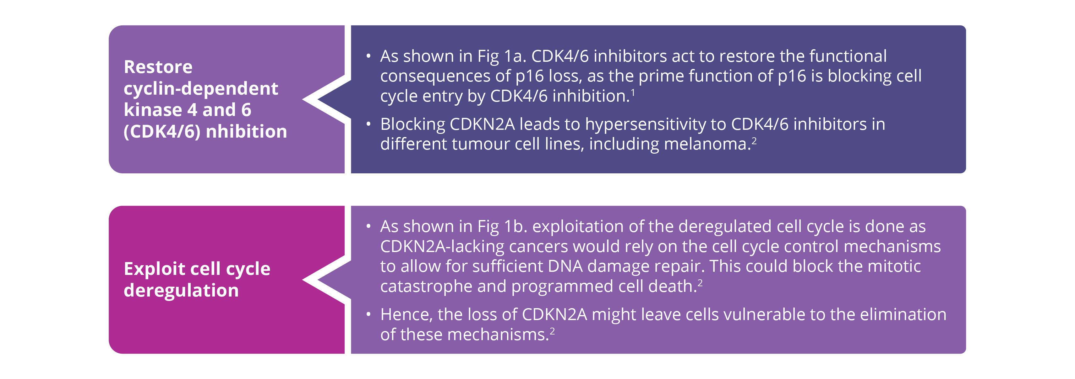 Loss of p16 in melanoma could increase proliferation, slow down ageing, and introduce invasion, ultimately leading to melanoma.2 Figure 1 describes the various therapeutic approaches used for the loss of CDKN2A in melanoma.2