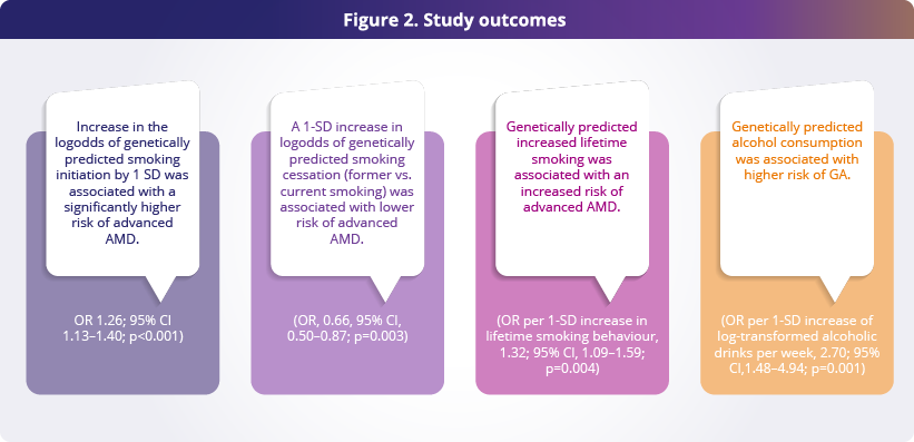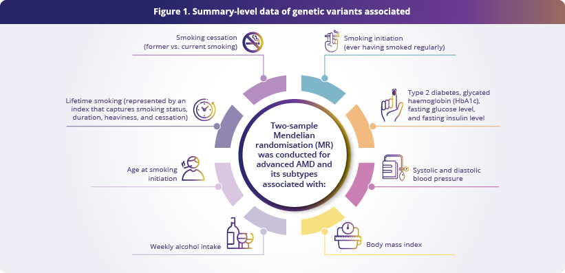 - A two-sample mendelian randomisation (MR) was conducted; summary-level data of genetic variants were obtained from study samples that did not overlap with those for advanced AMD and its subtypes associated with certain genetic variants (Figure 1).