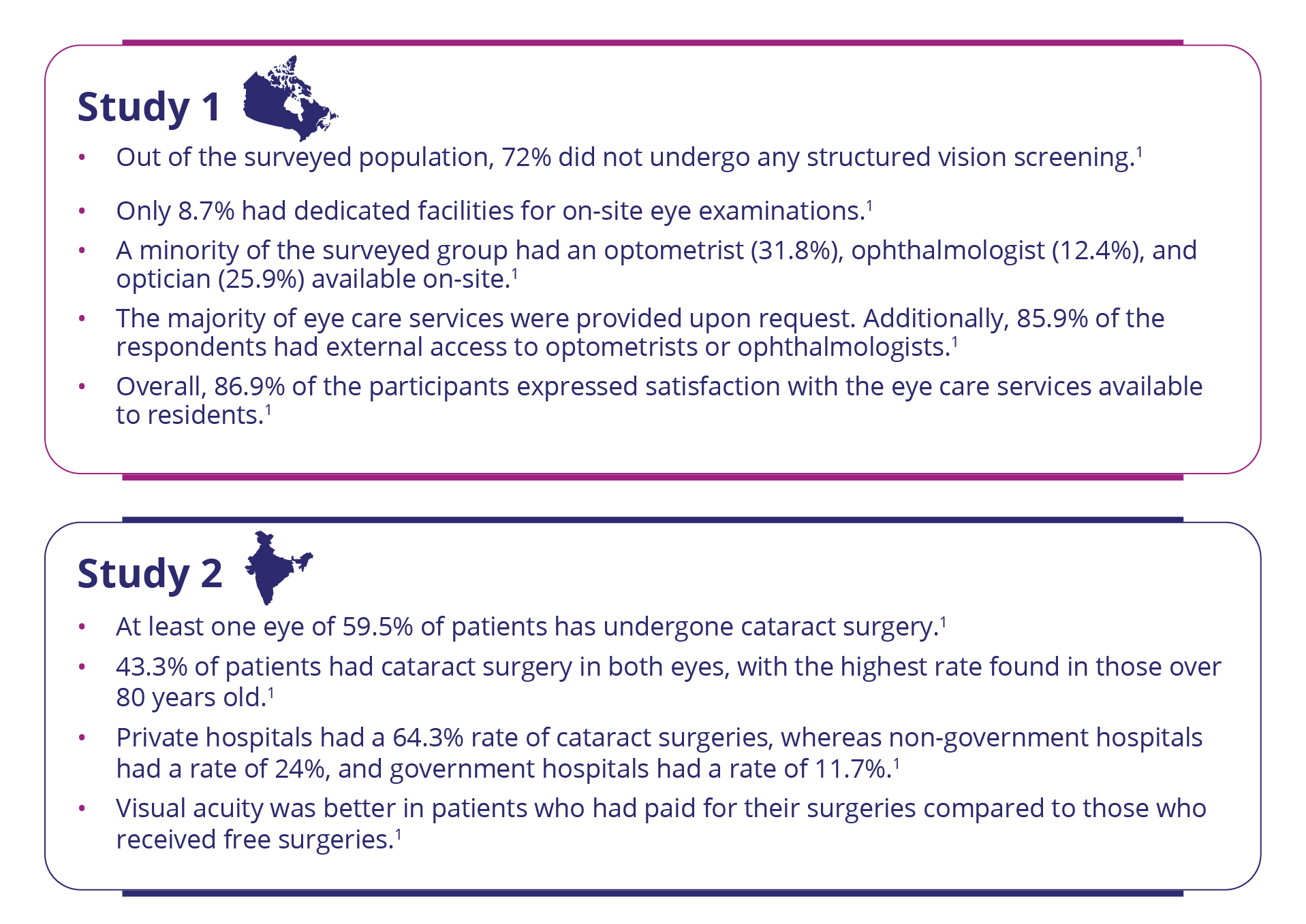 The provision of eye care services in care home settings was assessed by two studies conducted in Canada and South India.1