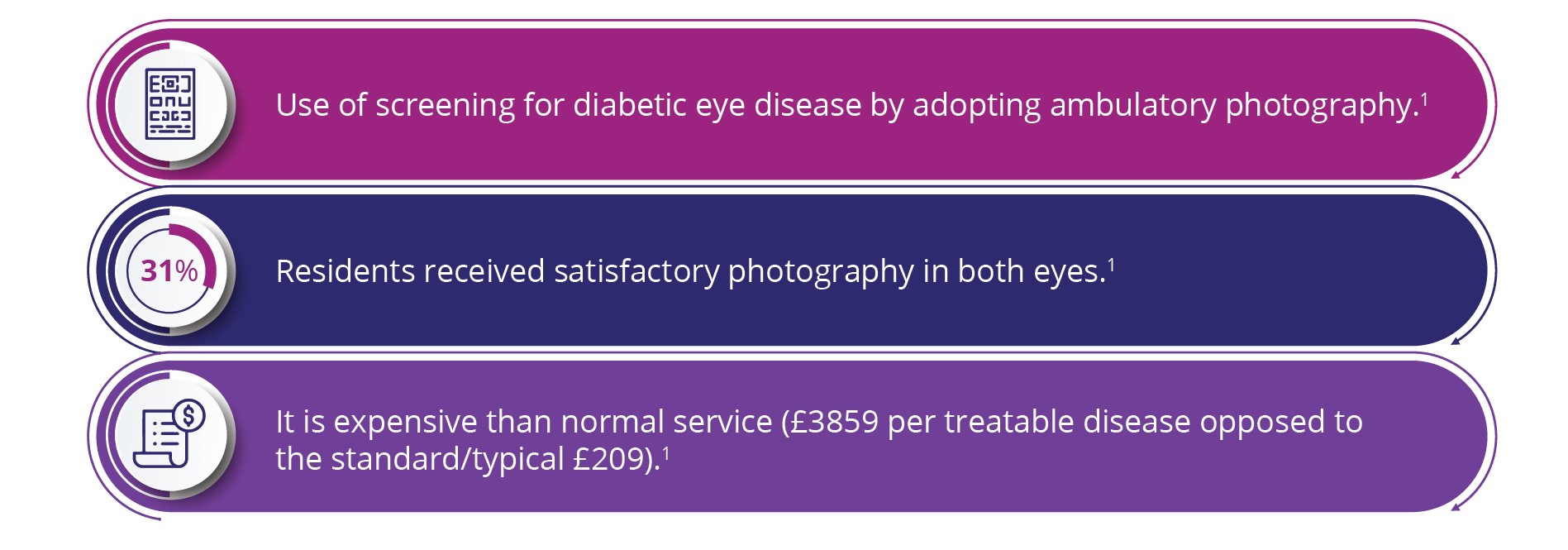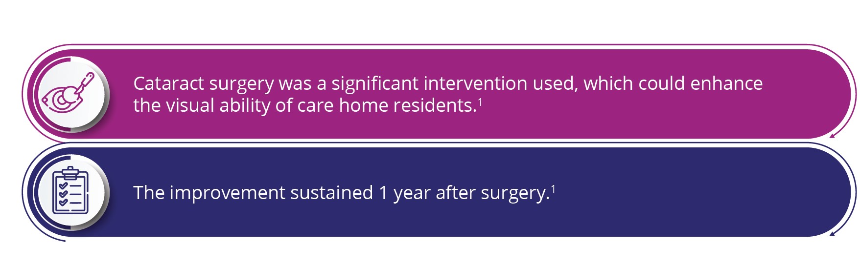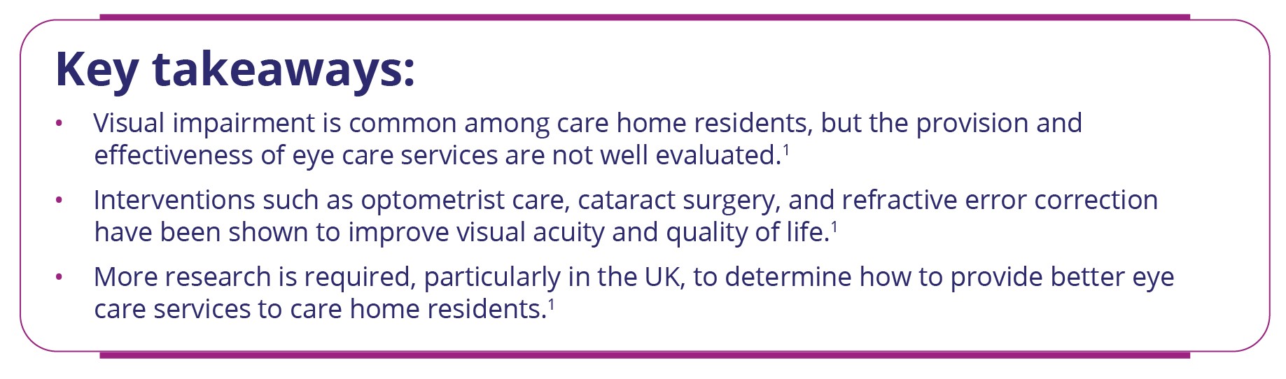Care home residents commonly present with multiple co-morbidities and have complex care needs. Routine access to eye care has been widely acknowledged to facilitate early detection and timely treatment of age-related ocular pathologies, while also helping to maintain the independence and quality of life of residents in the care home setting, where they rely heavily on their care providers.1