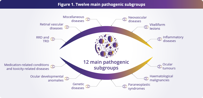 Since distinguishing between these diseases and CSC might be difficult, the author provides an extensive differential diagnosis of CSC. The study highlights the pathogenic mechanisms specific to each disease, which aid in the differential diagnosis. These diseases can be broadly categorised into 12 main pathogenic subgroups (Figure 1).