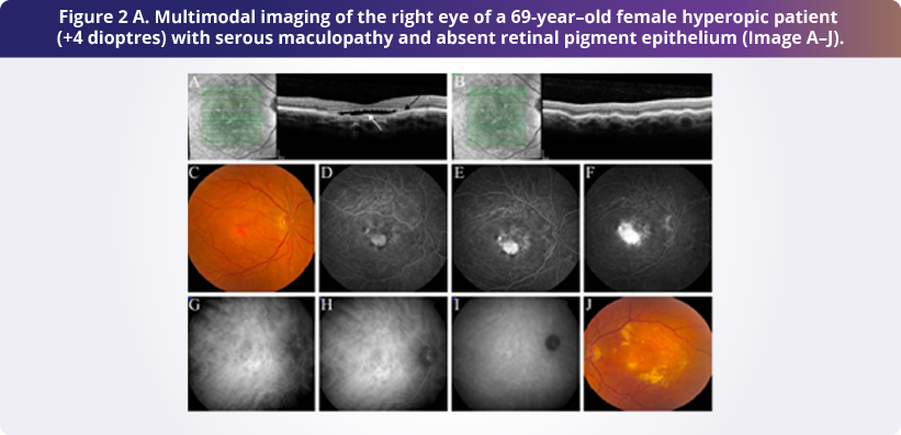Serous maculopathy with the absence of retinal pigment epithelium and serous maculopathy due to aspecific choroidopathy (Figure 2, A and B).